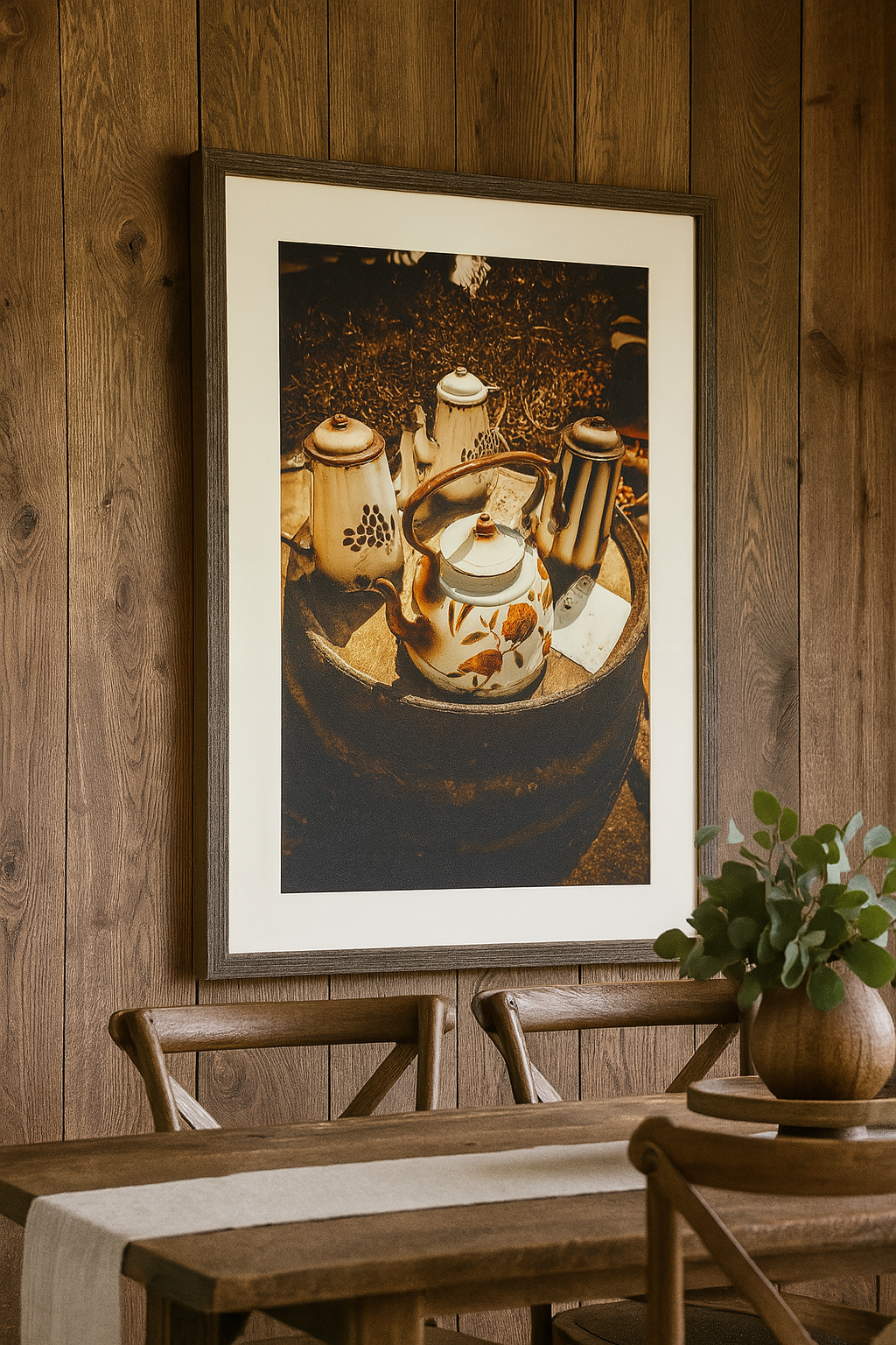 In Maltese Vintage Teapots, Anton Farrugia invites viewers to pause for a quiet moment of nostalgia. This rustic scene of enamel teapots atop an old barrel recalls warm kitchen gatherings and simpler times.